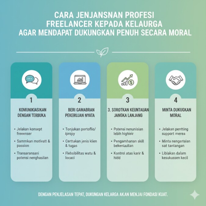 Mendapatkan dukungan keluarga sebagai freelancer memang membutuhkan proses dan kesabaran. Dengan pendekatan yang tepat, penjelasan yang jelas, serta sikap dewasa, keluarga akan lebih memahami dan menghargai pilihan kariermu. Dukungan moral dari keluarga bukan hanya memperkuat mental, tetapi juga menjadi energi positif untuk berkembang lebih jauh sebagai freelancer profesional. Jika kamu mau, aku bisa bantu buat versi artikel ini dengan gaya bahasa yang lebih santai atau lebih formal sesuai target pembacanya.